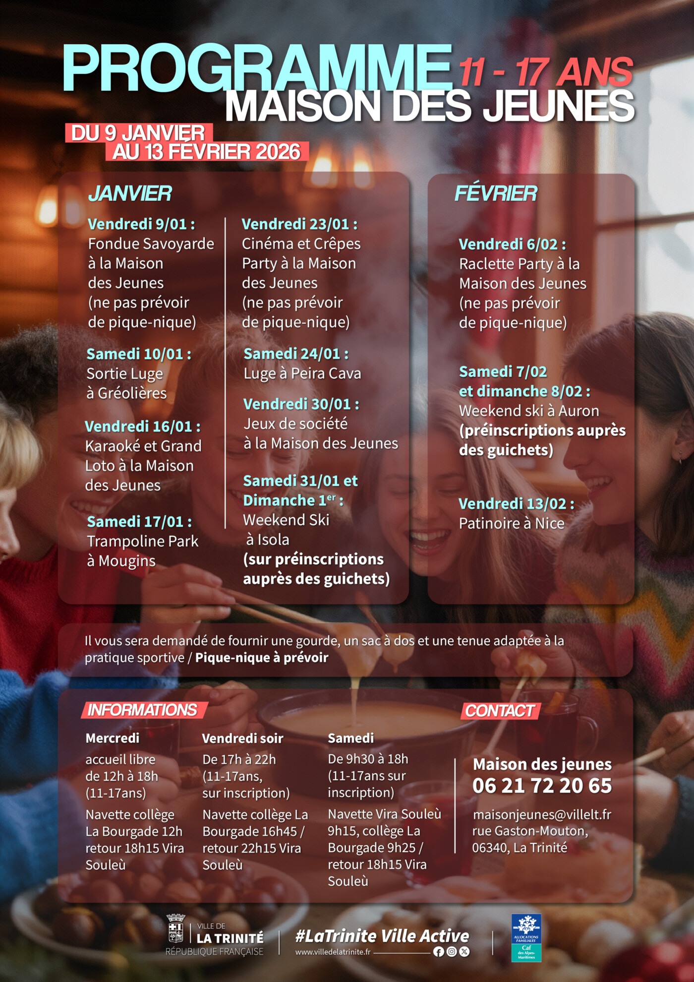 Du 9 janvier au 13 février, la Maison des Jeunes accueillera les jeunes trinitaires avec un programme riche et varié :